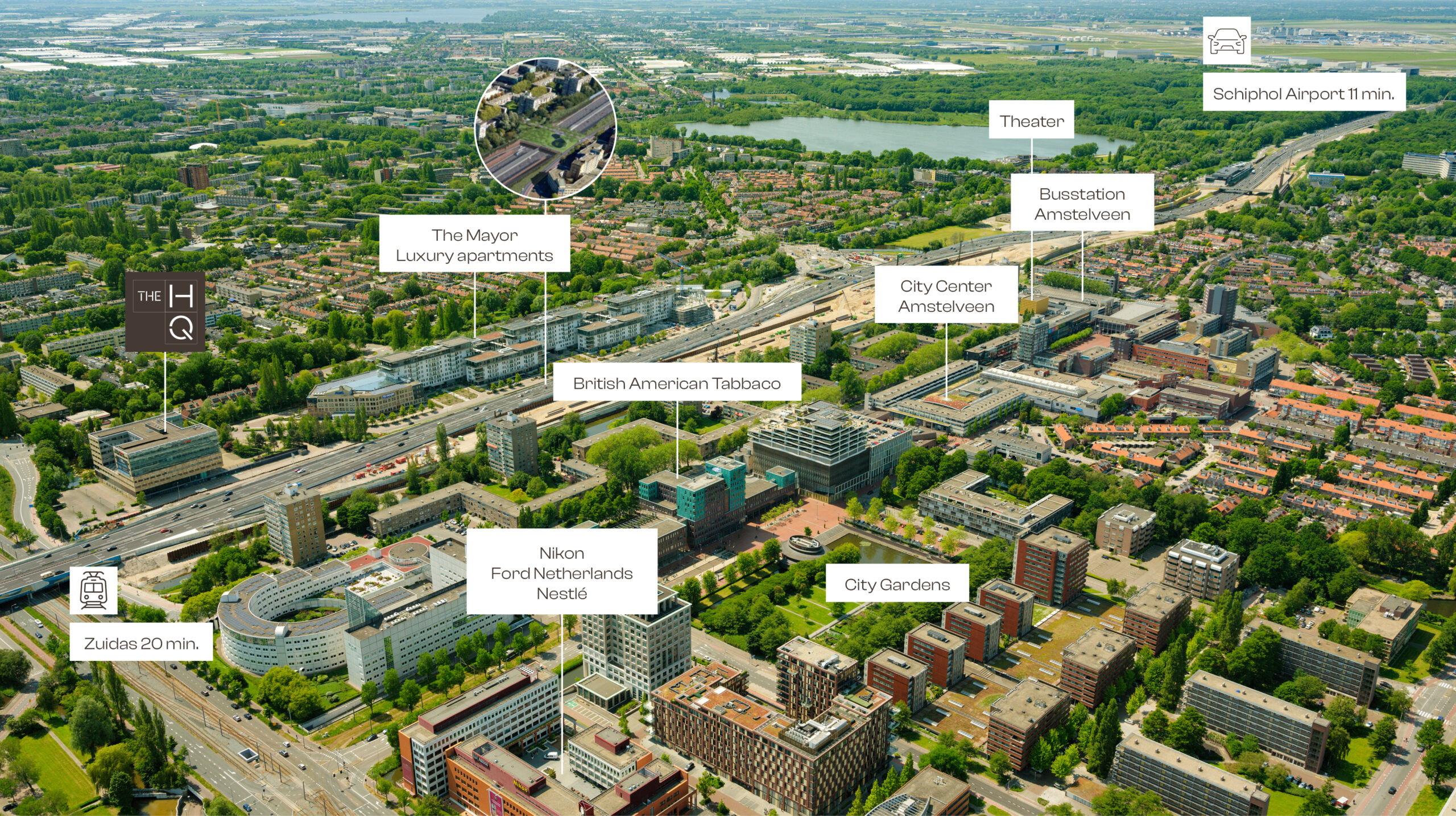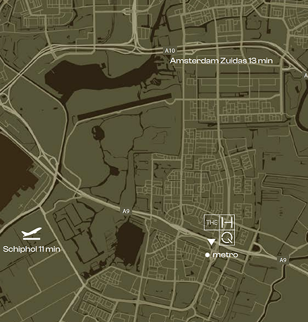 The HQ is strategically positioned just outside Amsterdam, directly along the A9 motorway. Accessibility by car and public transport is excellent, while avoiding inner city congestion. Schiphol Airport and the business district of Amsterdam Zuidas are both within easy reach. Frequent tram and bus connections link Amstelveen to Amsterdam and the wider region. This combination of visibility, accessibility and connectivity makes The HQ a reliable base for organisations operating locally and internationally.